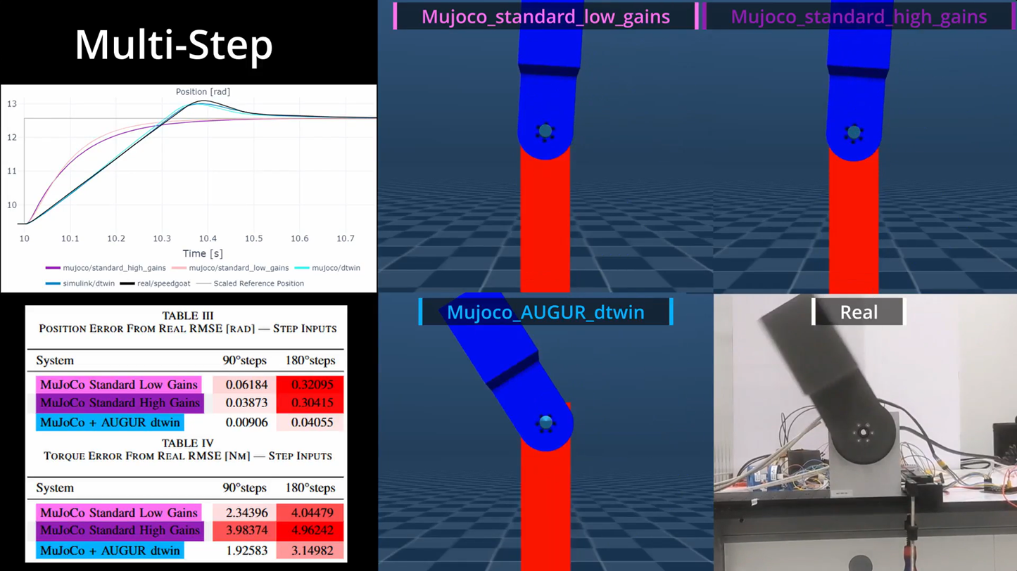 The following use cases highlight AUGUR’s versatility: from validating a single actuator against experimental data to scaling up to multi-joint humanoid arms while running faster than real time.